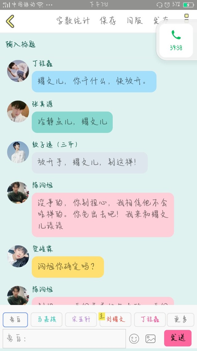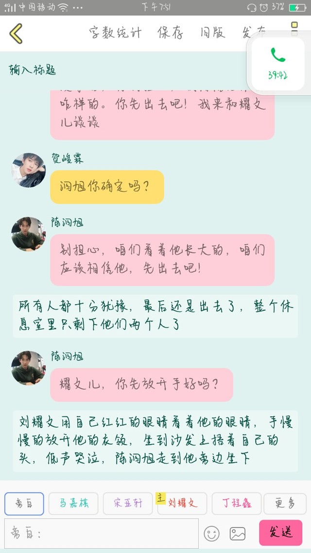 陈泗旭我当然理解文文的做法了,不然今天也不会说这么多,而且文文要知道,你已经17了,不是小孩子了,也要准备高考了,不能分心,有些事不能再任性了,因为你才是满月的天,但也要记住,在我们这里,你就可以随意任性一些,因为我们也是你的天……