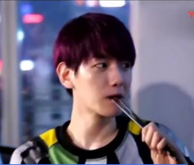 边伯贤在宿舍里练习基本功,把一个筷子放在嘴里面练习到。