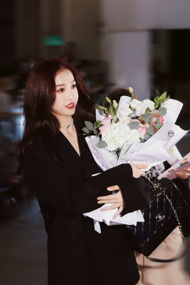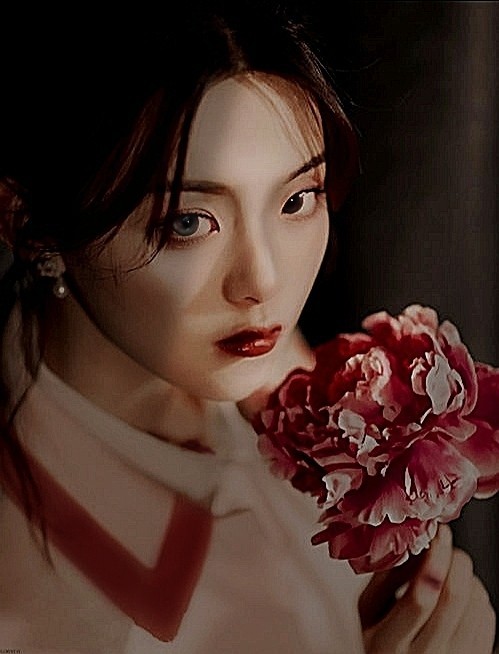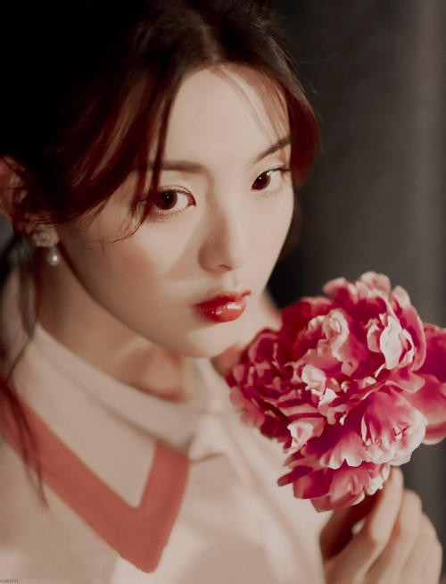 手里的鲜花很艳明显是假花,而花的颜色偏于血色,与嘴唇上的一部分颜色对应,让人不禁深思花背后所引出的故事。
