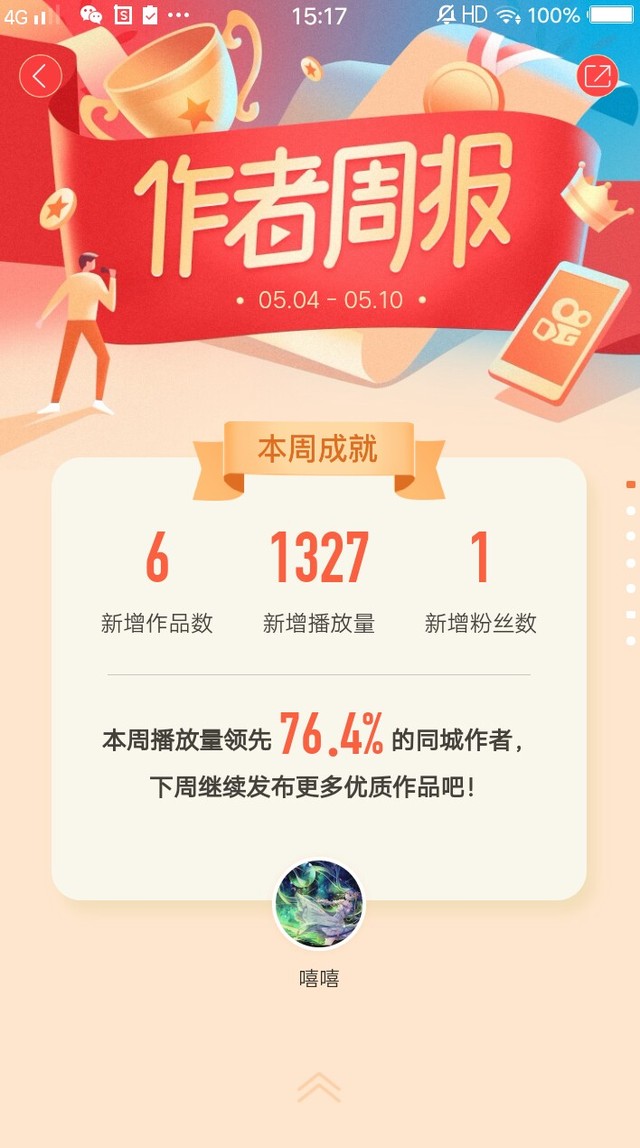 旁白播放量比上用少好多,才领先了76.4%的同城作者。