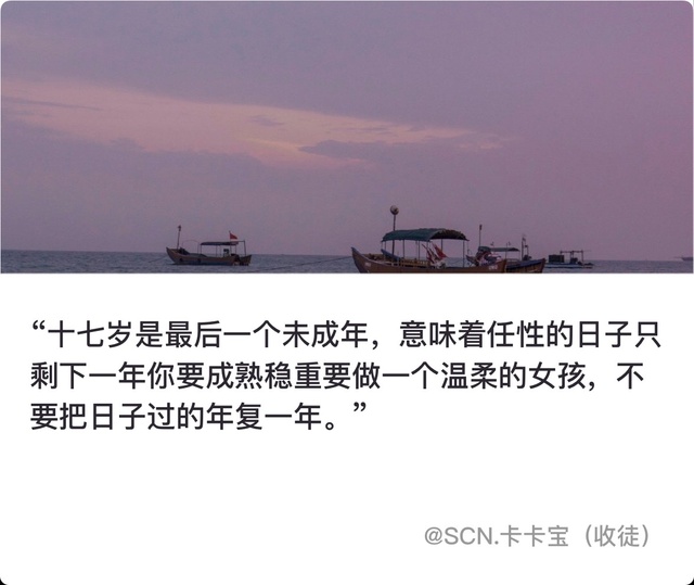 “十七岁是最后一个未成年,意味着任性的日子只剩下一年你要成熟稳重要做一个温柔的女孩,不要把日子过的年复一年。”