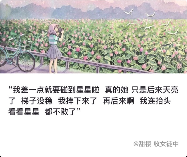 “我差一点就要碰到星星啦真的她只是后来天亮了梯子没稳我摔下来了再后来啊我连抬头看看星星都不敢了”