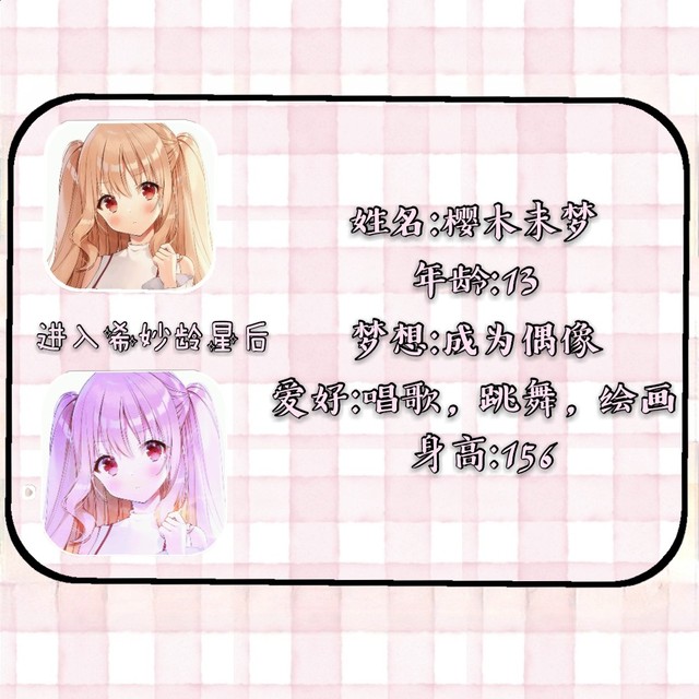 作者素雪恋酱姓名:二宫千寻 年龄:13 梦想:偶像 爱好:总是对某些事情好奇 身高:155