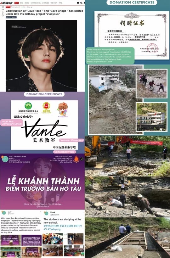 中国正在修建以防弹少年团金泰亨命名的“金泰亨道路”和“金泰亨桥”,成为了热门话题。该项目于去年12月筹集了约2万1千美元(约2500万韩元)的基金,于上月20日宣告了工程的开始。据媒体报道,中国陕西省紫阳县麻柳镇赵溪村正在进行100米长的道路,10米长的桥梁工程。位于麻柳镇的百利阳光希望小学被大山环绕,学生们每天早上要经过长达110米的未铺设水泥的路和一下雨就会涨水的溪流,由于道路恶劣的路况使他们迫切需要通勤路。百度金泰亨吧给麻柳镇的学生送上了“金泰亨路”和“金泰亨桥”礼物,向学生们展示了他们善良的影响力,成为了学生们梦想的桥梁。一直以来,金泰亨的全球粉丝都为社区,特别是为孩子们做了很多善事。支持孩子们克服恶劣的环境和状况,向着美好梦想前进的粉丝们的善举被评价为很好地展现了进化的粉丝文化的一面。