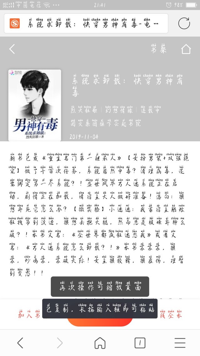 作者简介:【女扮男装+双强绝宠】做了千百次任务,系统居然中毒?清理病毒,还要绑定另一个系统?!盛世风华万人迷系统正在启动,剧情正在加载,请宿主大人做好准备!洛白:很想弄死它怎么办?【微笑脸】小迷迷:我家宿主酷炫狂拽吊到没边,很想去抱大腿,然而总是被嫌弃肿么破?!本书又名:《全世界都疯狂迷恋我》或者又名:《万人迷系统怎么卸载?!》本书苏苏苏,很苏,炒鸡苏,苏破天际!女主很狡猾,很虚伪,理智到变态!!