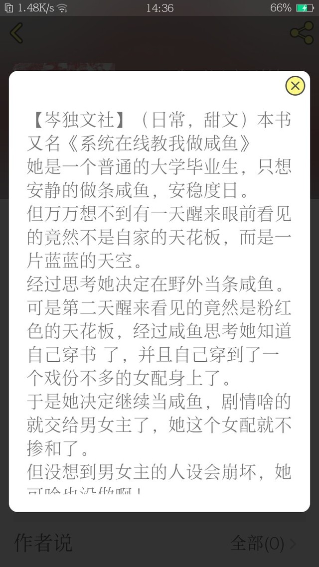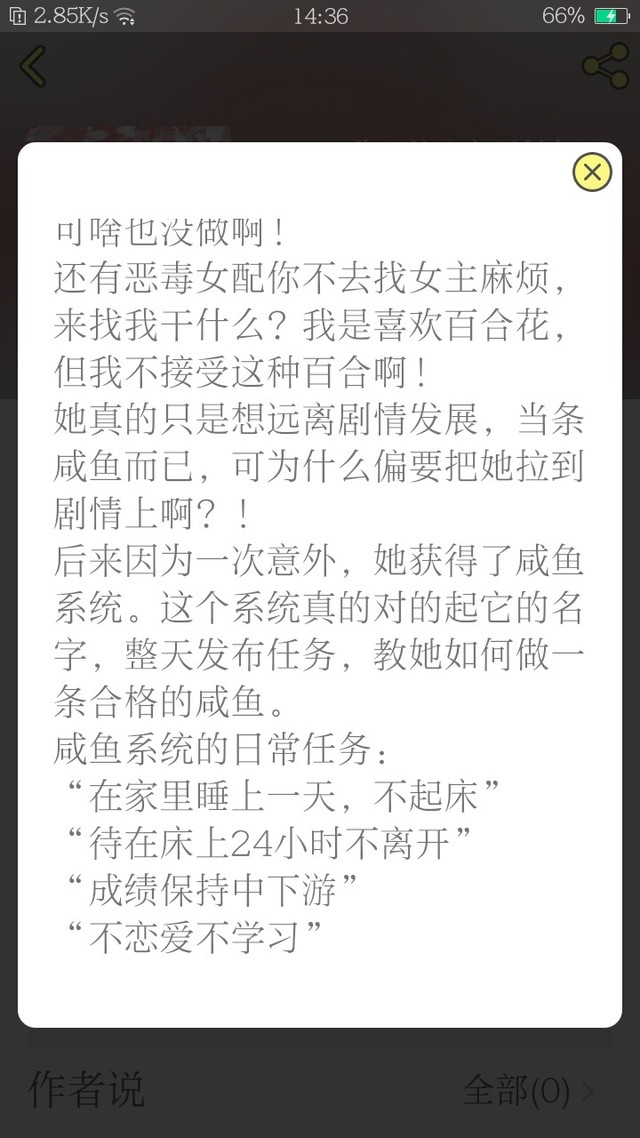 主线,简单来说就是女主穿越了,然后打算当咸鱼,但被很多人喜欢,又有一个系统发布任务,等等,结局我不知道,不做评价。