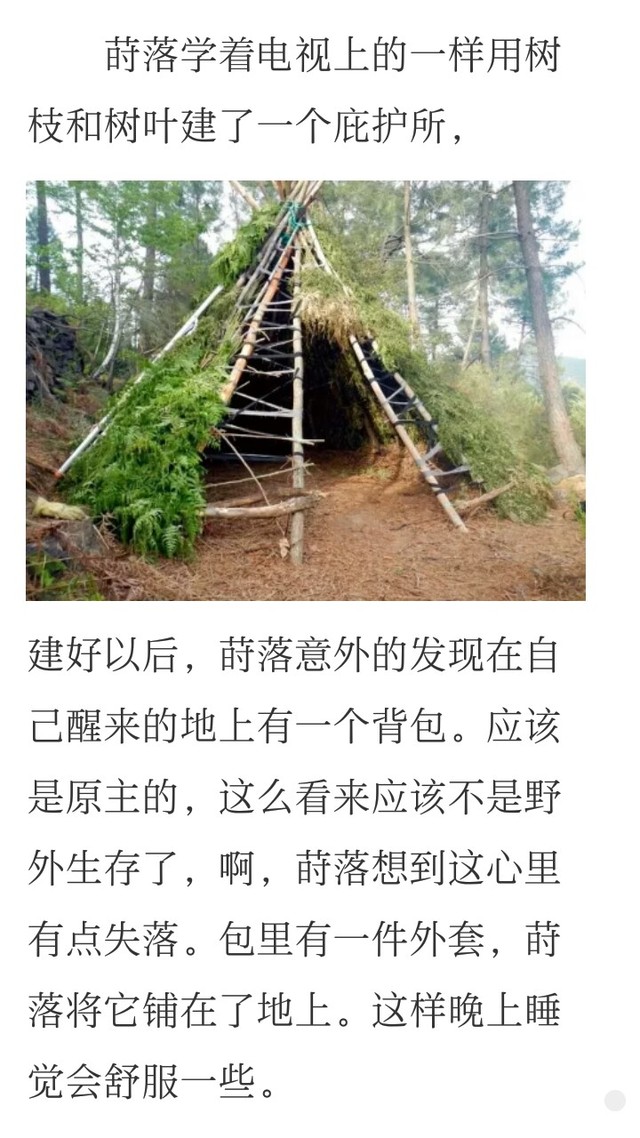 ……建好之后才发现地上一个背包?先不说求生节目是女主小时候看的,现在还记得,就连庇护所也会做,就单单是建庇护所也需要找材料吧,四处找材料的过程中,连包都没看见,建完了又看到了?🤔