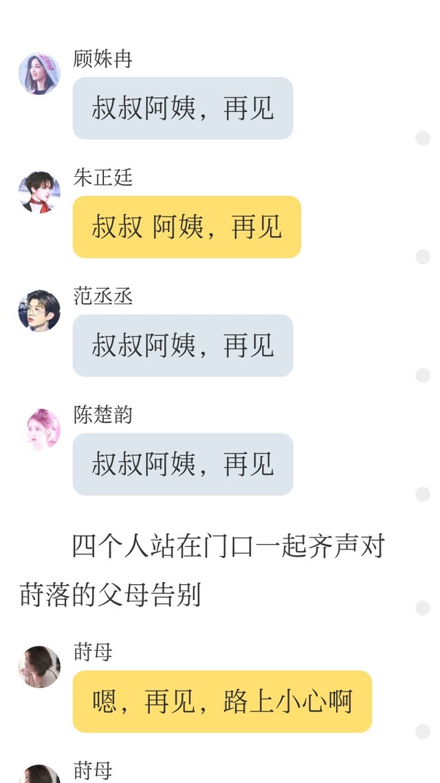 可以换成旁白呀,就说四人一同道:“叔叔阿姨!再见。”
