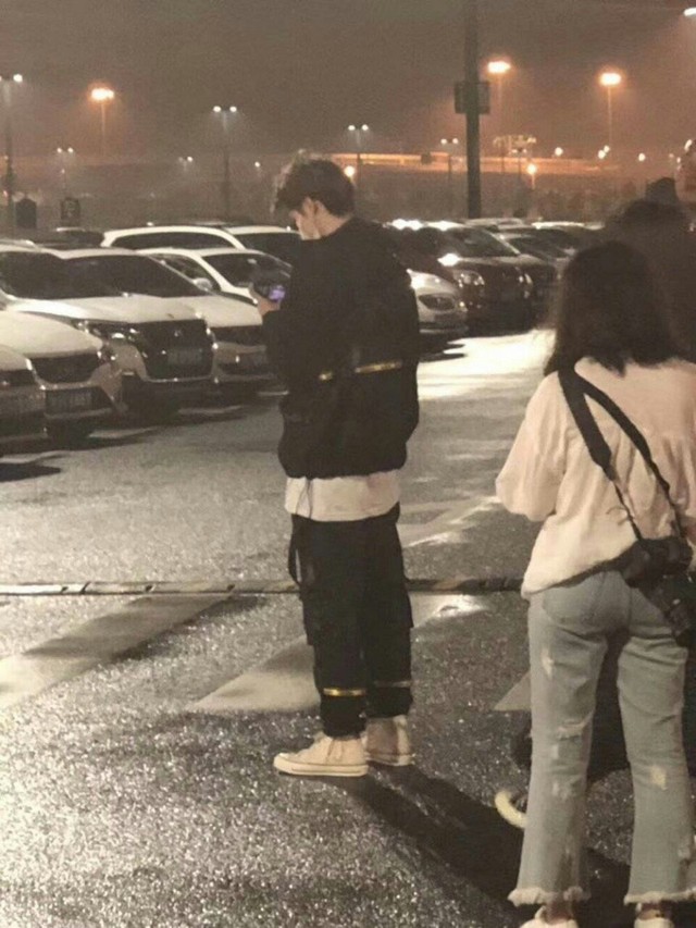 王一博从剧院里出来,给在台下看他表演的女朋友打电话。