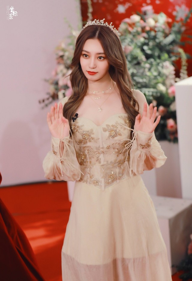 徐艺洋穿着跟她的肤色相近的礼服,衬得她的皮肤更白更亮,略低的领口上是一条明亮的项链,本来不笑的时候长着一副冰山美人的面孔,但她走红毯的惊艳很少,虽是节目组安排场面也不大,难免有一点点局促。