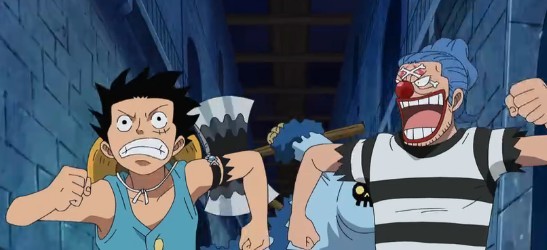 碰巧也在这时,路飞偶遇了当初的四分五裂果实能力者,小丑巴基,这家伙正被狱卒蓝猩猩追得到处乱窜,而且向着他的方向跑来。