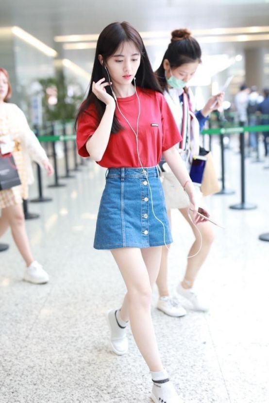 刘若瑾以最快的速度打扮好自己,在脸上化了个淡妆,穿着一件红色上衣,搭配牛仔裙,活脱脱一个阳光少女