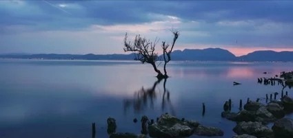 远远望去还有连绵起伏的山丘,从近处看还有一棵树和熙熙攘攘的草在湖里,云挡住了阳光,阳光好不容易从云的缝隙中挤出了一丝丝亮,显得格外的美丽。