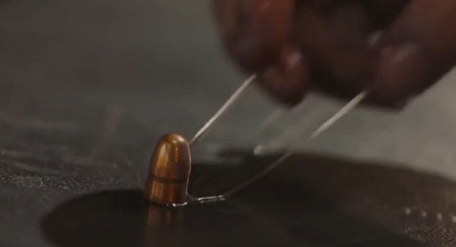女鬼从脑袋后面拔出一颗子弹,放在桌上。