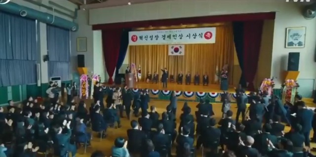 朴奎浩急急忙忙查看自己的胸口也没有伤口,他自己也吓了一跳。等他转过头看上身后,后被他杀害的警察就站在他面前,他被吓得往后退了一下。