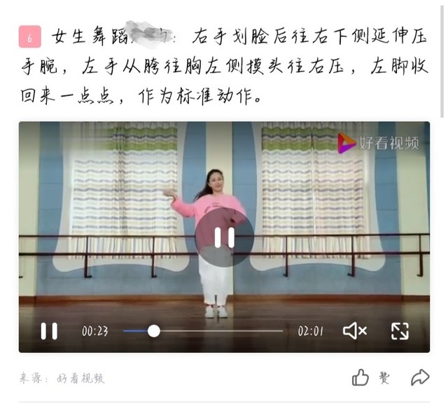 伴奏响起时,大家齐刷刷的扬起右手,划过脸庞后往右下方压手腕,左手从跨往胸左侧摸头往右压。
