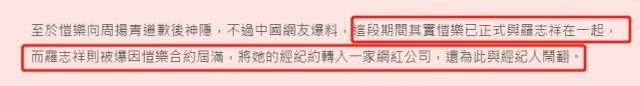 周扬青在文章里讲罗志祥有另外一部专门用来撩妹的手机,并在周扬青不在家的时间几乎每一天都会约女生来家里,自己去每一个城市工作都有可以约到酒店的女孩子,还和自己旗下的女艺人和化妆师又长期不正当男女关系。最过分的还是他还经常举行正常人都无法想象的多人运动,让非常多粉丝也是大跌眼镜。之后蝴蝶姐姐简恺乐就发微博道歉,还有郑爽参与评论,直接让周扬青和罗志祥事件进一步发酵。