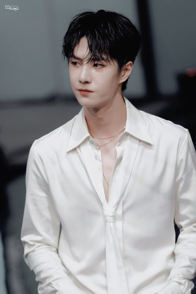 王一博脱下了、试妆照那套严谨的军装外套,干净的白衬衫、被故意染上暗色的血渍。