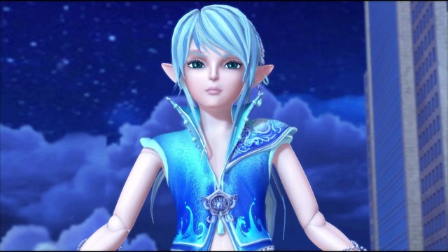 蓝色的头发和眼睛,精灵一样的耳朵。全身白的不像真人。