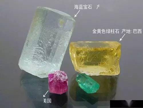 匿名14、 绿柱石 后左:海蓝宝石>产地:巴西; 后右:金黄色绿柱石>产地:巴西; 前左:红色绿柱石>产地:美国犹他州; 前右:祖母绿>产地:哥伦比亚