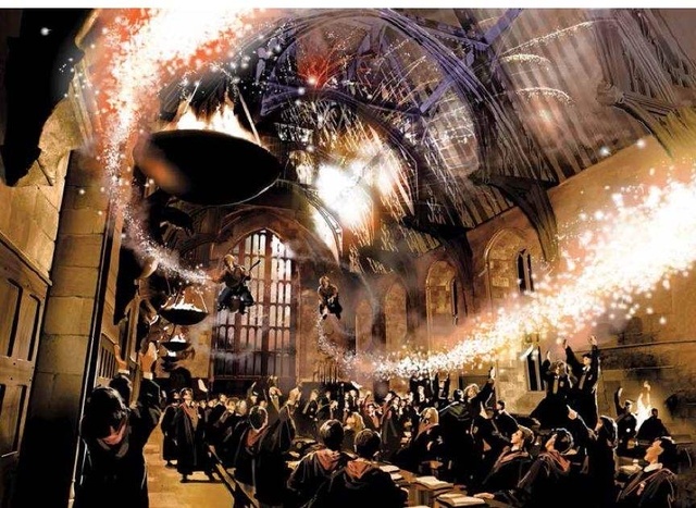 这时韦斯莱双子骑着飞天扫把飞了进来放起了烟花