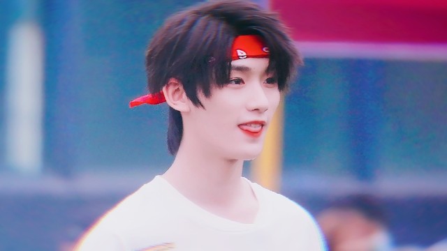他今天一身青春洋溢的运动装,白色T恤搭配红色长裤,自然卷乖乖地翘在脑门前,说不出地可爱。更令人疯狂的是,他额头上系着活泼的红色发带,与灵动妩媚的眼睛互相映衬,相得益彰。