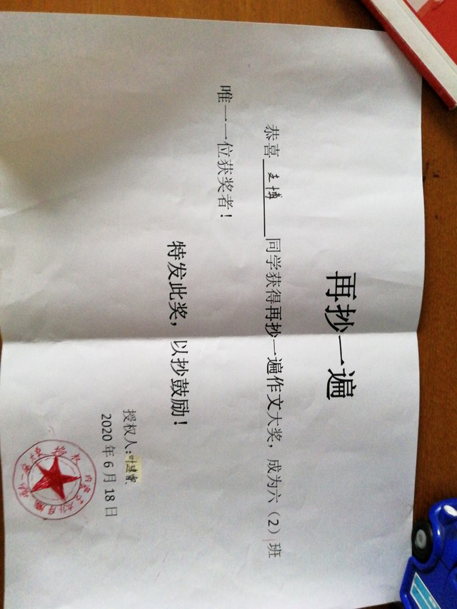 叶子童鞋(叶建睿)恭喜支博同学获得再抄一遍课文奖