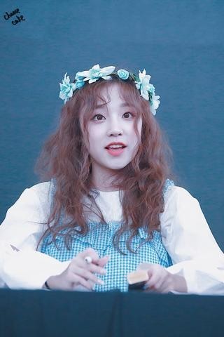 这个女生有一头卷卷的泡面头发,棕色的,看起来俏皮又可爱,头上戴了个蓝色的花环,显得她很优雅,脸上没有化浓浓的妆,只画了一个淡淡的唇膏,看起来清纯又不失美丽,穿的衣服也是很好看的,一件白色的衬衣,蓝蓝的背带裙穿在外面,真是个精神小妹呢