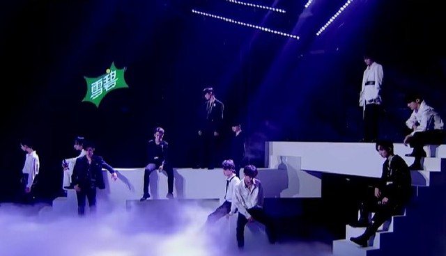 刚开始实焉栩嘉的rapper,风格很酷😎,11个人的穿着打扮都是黑白色。