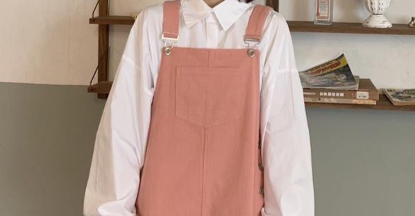 白色灯笼袖衬衣搭配上粉色背带裙,满满的学生气