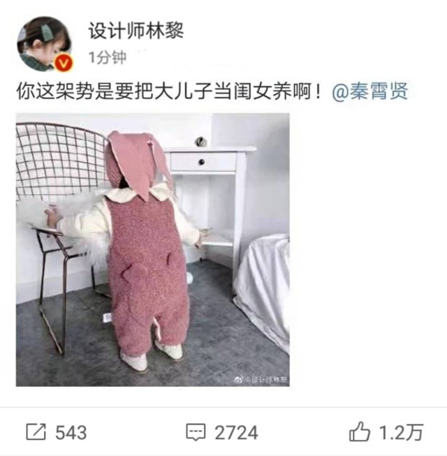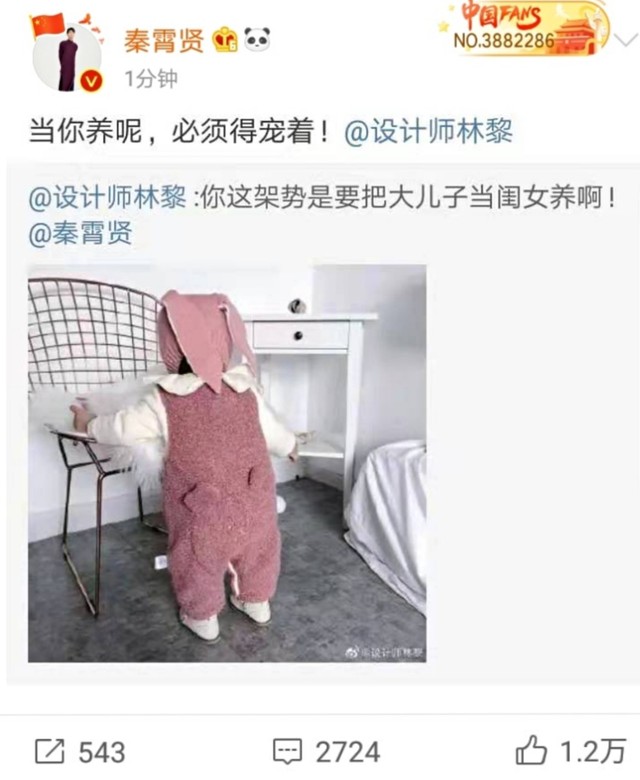 (秦凯旋)秦霄贤从结婚到现在,冒着生命危险为我生孩子,一直帮我照顾爸妈和孩子,我也见证着她从设计师变为了全职妈妈。
