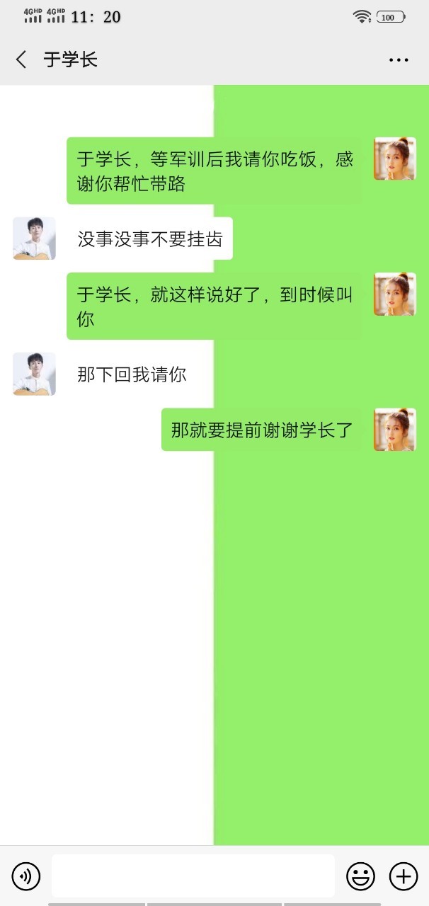 孟逸然没什么刚才用微信跟于学长说军训后请他吃饭