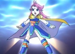 一束深蓝色长马尾穿着黄色战斗服,左手上套着蓝色护腕,她正是灵剑双子中的会开星船的姐姐-宗梦灵。