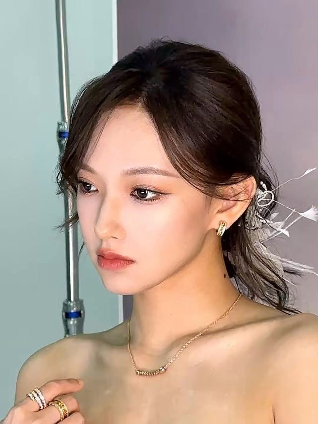 金色耳环与细链项链相得益彰,在灯光下泛着低调而精致的光泽。