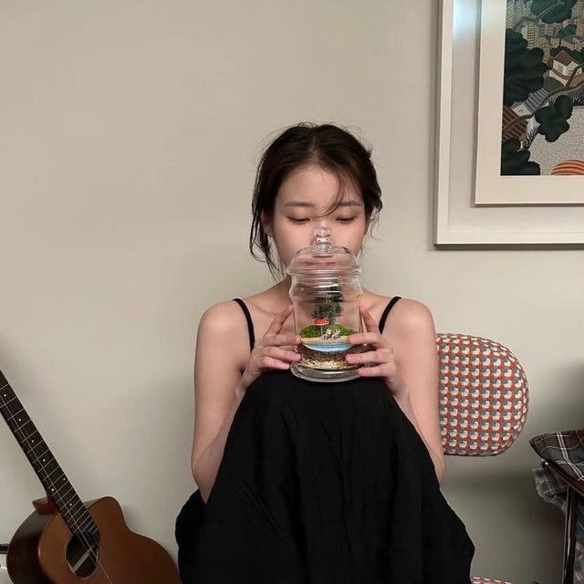 相比边伯贤,李知恩这边的灯光更亮,让她整个人在镜头里清晰可见,在柔和的灯光下,她静静坐在那张深褐色的木椅上,身体微微前倾,纤细的双手轻抚着吉他琴颈。她身穿一件黑色吊带长裙,勾勒出优雅的身姿。指尖在琴弦上轻轻拨动,仿佛在酝酿着一段动人的旋律