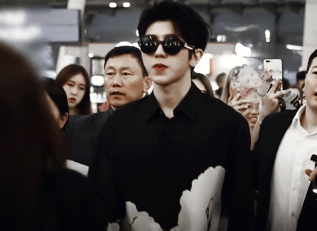 蔡徐坤双手插兜,一身休闲黑色衣服,带着一副黑色墨镜遮住了那双勾人眼眸,模样淡淡的.