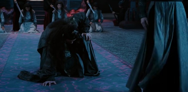 魏无羡、蓝忘机、文姝三人一直形成一个三角打法,将围向他们的傀儡一个个击杀。突然一个变身的傀儡向魏无羡砍去,却被蓝忘机拦下,魏无羡飞身上了一高处,从高处俯视眼前的这一切惨状。