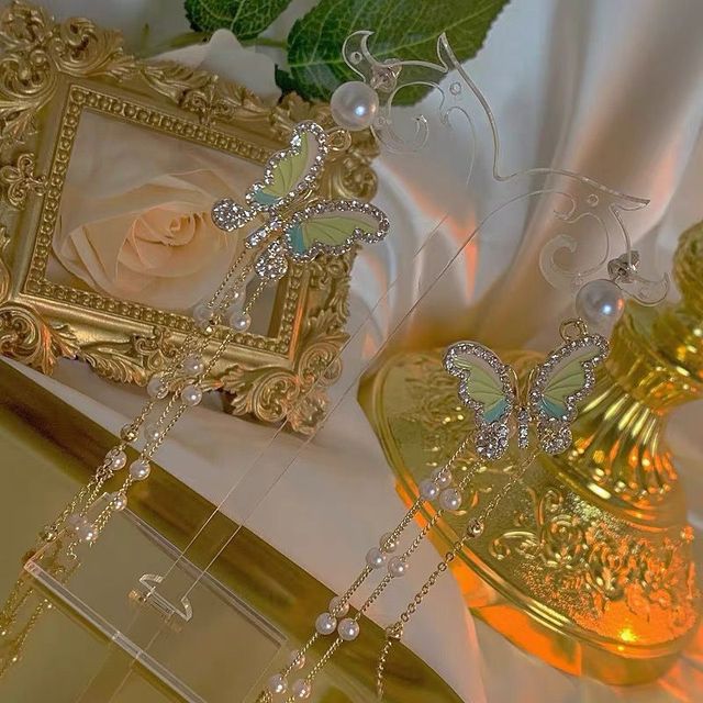 首饰盒里是一对有着绿色翅膀的蝴蝶耳饰,翅膀上镶嵌了一整圈的碎钻在灯光下闪着彩色的光让人看一眼就完全移不开眼睛,在翅膀的下面还坠着几条流苏让耳环增添了几分温柔贵气的感觉