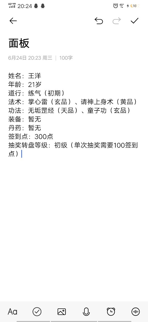 系统“叮~恭喜宿主完成三次签到任务,已解锁人物属性面板,宿主可以随时查看人物属性”