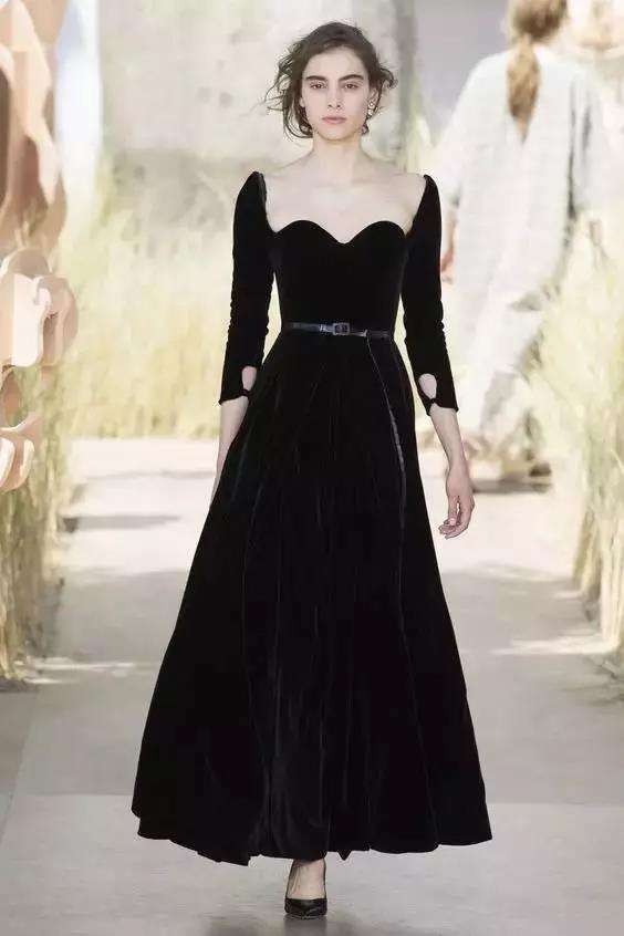 助理拉开帘幕,模特人台上是一袭黑色丝绒礼服,领口大面积挖空。
