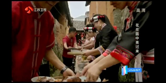 穿着畲族传统服饰的村民们在长长的露天宴席上摆上丰盛的饭菜