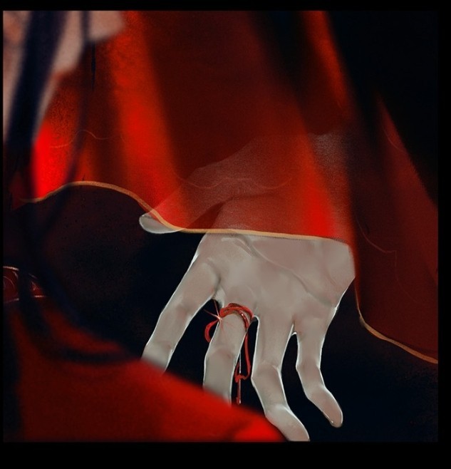 他的指节明晰。第三指系着一道红线,在修长而苍白的手上,仿佛一缕明艳的缘结。