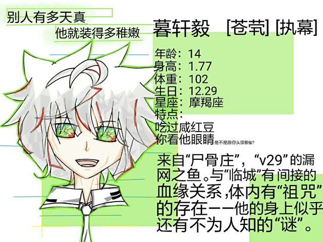 银色的头发中残着些血色,有些平刘海样的刘海中有几根突兀的银丝,发尾平平的;碧耀色的眼瞳里立着坚定与自信的“十”字。穿着套黑白搭配的短袖和短裤,系着条领带。整个人看起来神清气爽,是个阳刚的少年。