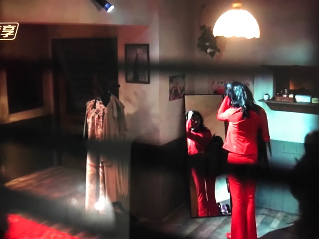周峻纬她穿着红衣服,她在卸眼妆,摘假发。