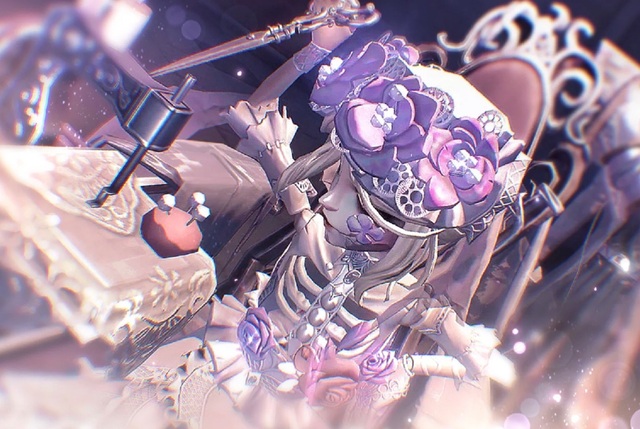 娇小的白色身影坐在宽大的轮椅上,蕾丝裙摆遮住了她的腿,隐隐可见那双赤白的脚。白发上套着紫色花环,在背后垂下轻纱。