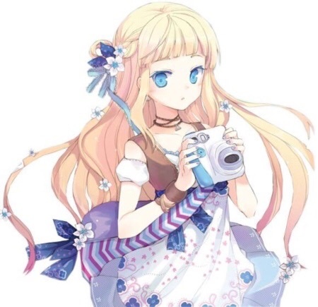 一个米色头发,头发上带着几朵蓝白色的小花朵,蓝色眼睛,穿着一件蓝白色衣服,拿着一个蓝白色相机的女孩子也说道