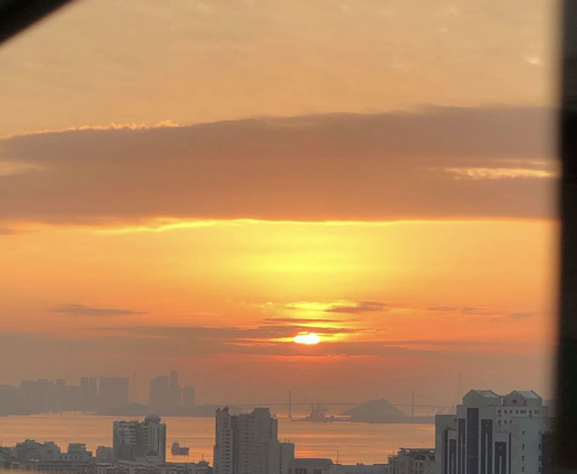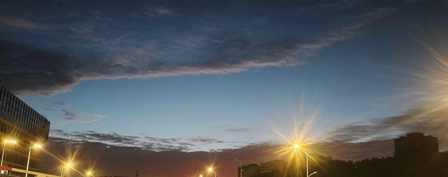 清晨,天空中间呈现青蓝色,两边淡蓝色,就像一块蓝翡翠。东方有一道五颜六色的彩霞,像一道道金光闪闪的利箭射向天空