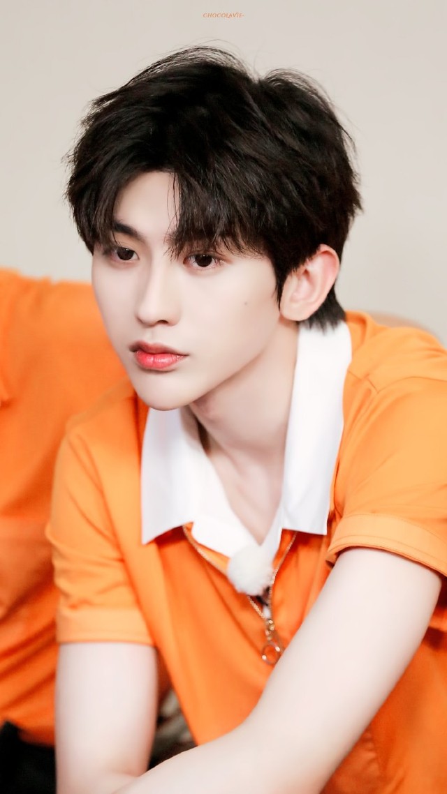 蔡徐坤换上了校服,衣服是橙色的,暖色系衬的他皮肤很白,他眼窝深邃,鼻梁高挺,唇色莹润,下颚线有些生硬,勾勒的好看。
