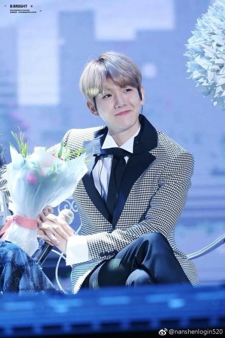 只见边伯贤笑眼咪咪,似乎心情很好。穿的也十分正经,手里还抱着束花