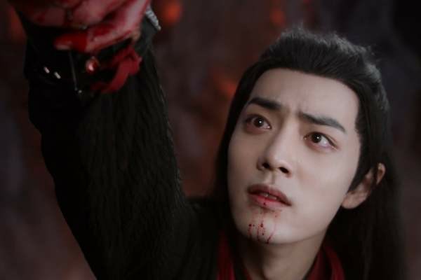 魏婴站在悬崖上哭着向后倒去,蓝湛在最后一刻抓住了魏无羡的手,却加重了自己手臂上的伤